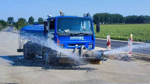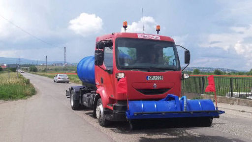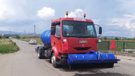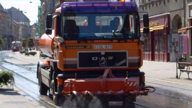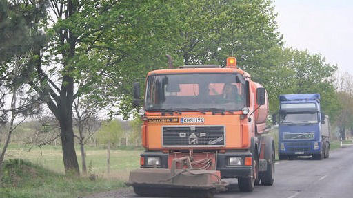 -utak, útburkolatok seprése, hűtése, pormentesítése orrseprővel szerelt 5-11 m3-es locsolóautókkal